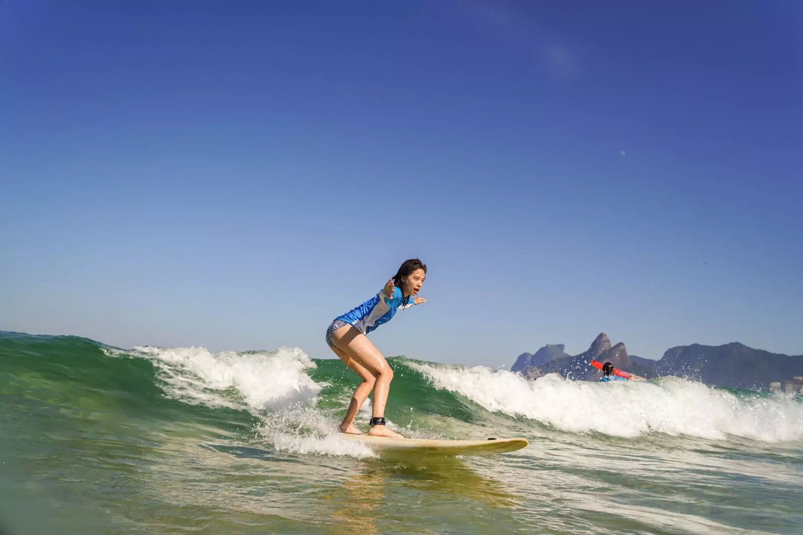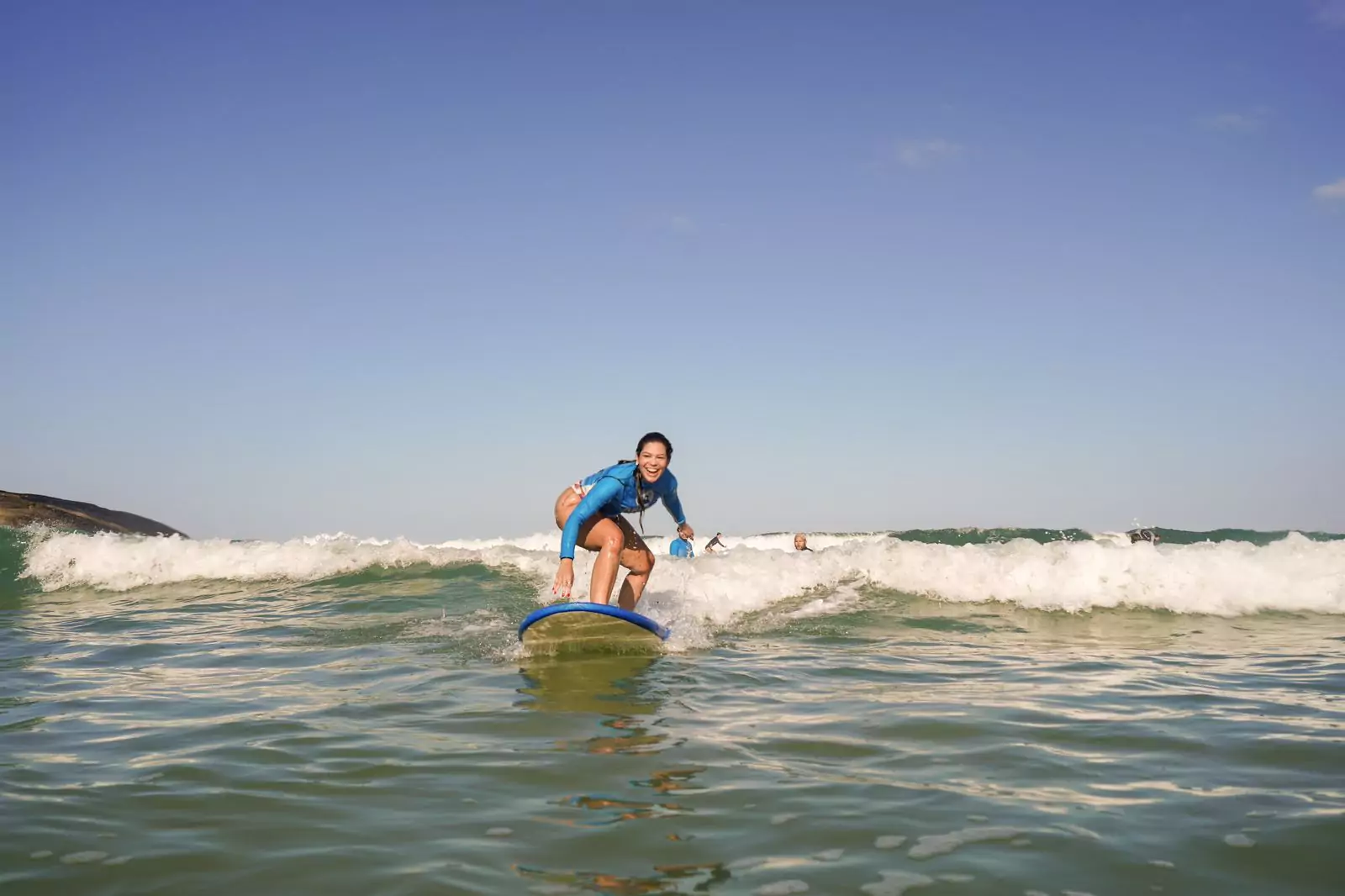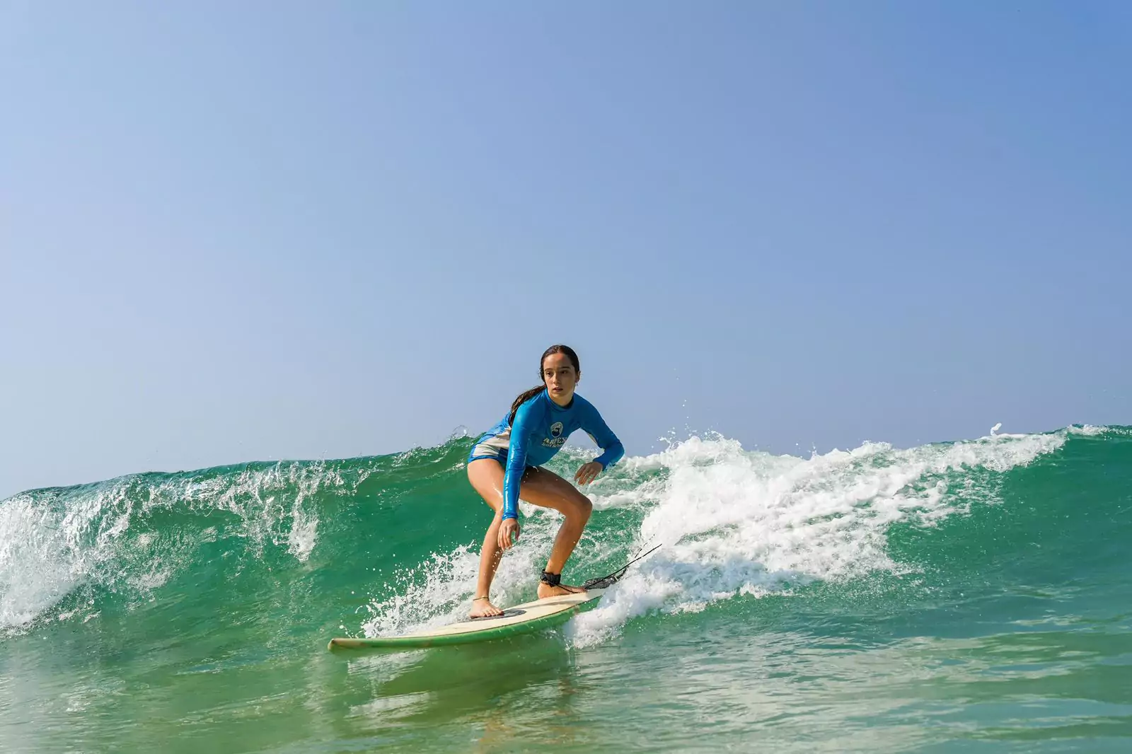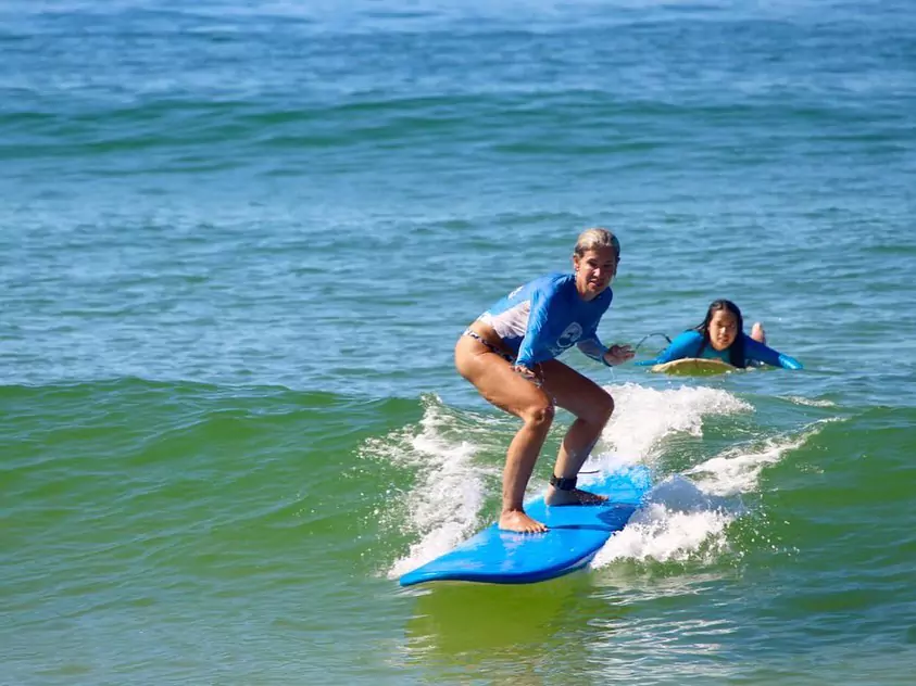 Ela oferece aulas para surfistas de todos os níveis, desde iniciantes até avançados.
